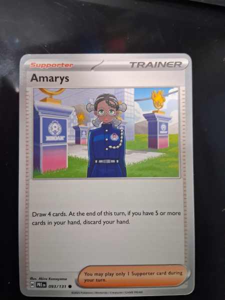 Explore the world of Pokemon with the Amarys Trainer-Supporter card from the Prismatic Evolutions set. Card number 093/131, this piece is a must-have for enthusiasts and collectors alike, offering a touch of strategy to your Pokemon TCG gameplay. Amarys is classified as a Basic card of the Common rarity, providing a steady addition to your deck or display. Crafted by The Pokemon Company International, the card boasts a standard finish and size, fitting seamlessly into your existing collection. Designed for the English-speaking market, it's suitable for ages 6 and up. Add this card to your repertoire and enhance your gaming experience with the charm of Amarys.