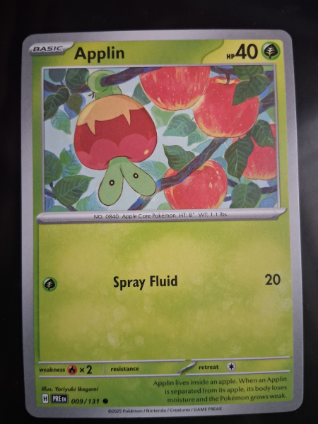 With card number 009/131, this English-language Pokémon TCG card is produced by The Pokémon Company and meets the standard card size specification. It's a common rarity card that has a regular finish, presenting a classic look for this collectable piece. Whether for play or display, this Applin card is a lovely addition to any Pokémon TCG assortment.