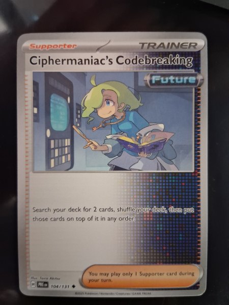 Expand your Pokémon TCG collection with the Ciphermaniac's Codebreaking card from the Prismatic Evolutions set. This uncommon Trainer card, numbered 104/131, features a human character and is a must-have for any enthusiast looking to enhance their deck with versatile strategies.