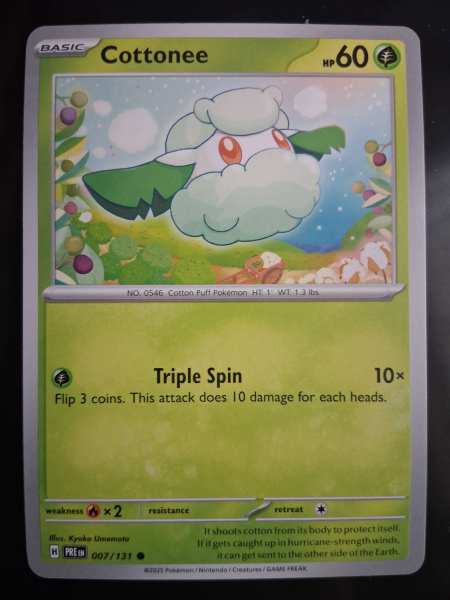 Explore the world of Pokémon with the 007/131 Cottonee card from the Prismatic Evolutions set. As a common card, it's an essential addition for players and collectors alike, featuring the quirky and lovable character Cottonee. With its standard card size and English language, it fits seamlessly into any existing collection or deck. Crafted by The Pokémon Company International, this card is produced with high-quality card stock material, ensuring durability and a premium feel. The card details include a HP of 60 and a regular finish, highlighting the straightforward, yet captivating design that Pokémon TCG is known for. Perfect for enthusiasts over the age of 6, this card is a timeless piece from the 2025 production run.