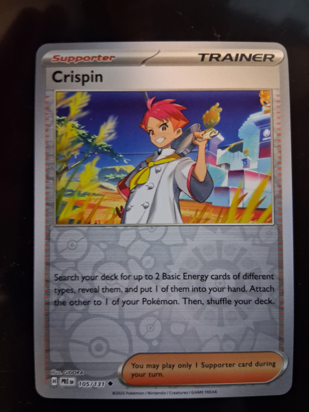 The Crispin 105/131 Reverse Holo card from the Prismatic Evolutions set of the Pokémon TCG is a standard-sized collectible made of card stock. Manufactured by Nintendo in the United States, this English-language Pokémon card features a Reverse Holo finish, making it a unique and sought-after addition to any collector's deck. With its rarity and connection to the popular Pokémon TCG game, this card is sure to be a prized possession for fans of the franchise.