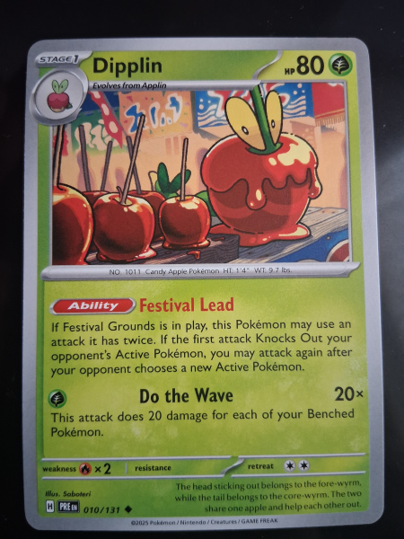 Dive into the world of Pokemon TCG with the Dipplin card from the Prismatic Evolutions set. This uncommon card, numbered 010/131, features the beloved character Dipplin in a stunning design that's sure to catch the eye of collectors and players alike. With 80 HP, it's ready for battle, and its English language print dates back to 2025, making it a modern addition to any collection.