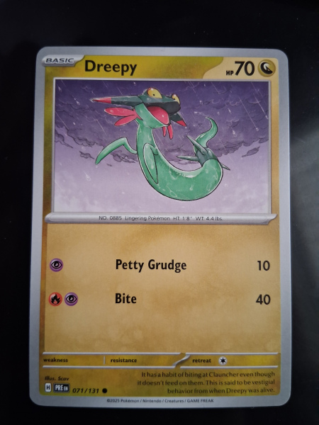 Explore the world of Pokemon with the Dreepy card from the Prismatic Evolutions set. With card number 071/131, this common card features the intriguing character Dreepy, ready to add depth to your Pokemon TCG collection. The card is printed in English and adheres to the standard card size, making it a perfect fit for any standard card protector or binder. Crafted by The Pokemon Company International, this piece hails from the USA and is designed for enthusiasts aged 6 and above. The finish is regular, maintaining the classic look of the card, and it's constructed from quality card stock material. Whether for play or display, this ungraded, timeless card is an essential for any Pokemon Trading Card Game aficionado.