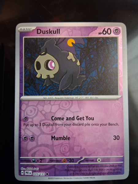 Duskull 035/131 Reverse Holo from the Prismatic Evolutions set. This card has a near mint and was sleeved upon booster pack opening.