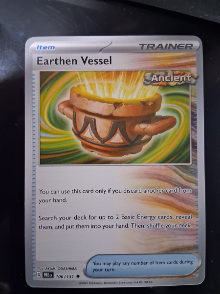 Explore the world of Pokémon with the Earthen Vessel card from the Prismatic Evolutions set. This uncommon Trainer-Item card, numbered 106/131, is a must-have for players and collectors alike, offering a touch of strategy and a dash of rarity to your deck. The card is printed in English and features the standard card size, ensuring compatibility with most Pokémon TCG binders and decks.
