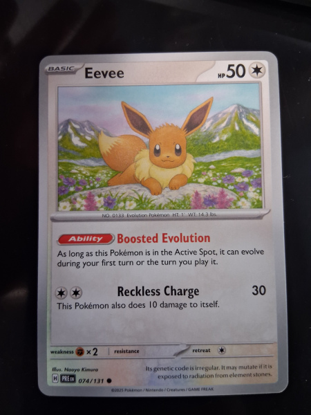 Dive into the world of Pokemon TCG with this delightful Eevee card from the Prismatic Evolutions set. Card number 074/131 features the ever-popular Eevee in its Basic stage, showcasing the beloved character in stunning detail. As a Common card, it's a must-have for collectors and enthusiasts looking to add to their deck or display.