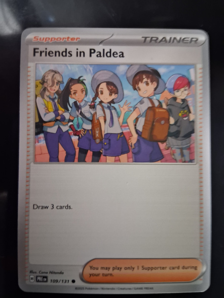 Explore the world of Pokemon TCG with the 'Friends in Paldea' card, a must-have for players and collectors alike. From the Prismatic Evolutions set, this common rarity card is numbered 109/131 and features the beloved character Friends in Paldea, ready to bring a touch of camaraderie to your deck or display. Manufactured by The Pokemon Company International, this English language card is designed for trainers aged 6 and above. The standard-sized card is made from durable card stock and comes with a regular finish, ensuring a classic look and feel as you add this Trainer-Item card to your collection.