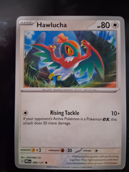 Delve into the world of Pokemon TCG with the 089/131 Hawlucha card from the Prismatic Evolutions set. This uncommon card features the fierce and formidable Hawlucha, a Basic Stage Pokemon with 80 HP, ready to bolster your deck with its unique abilities. Its English language print dates back to 2025, ensuring its place as a modern addition to your collection. Crafted by The Pokemon Company International, this card is produced in the USA and conforms to the standard card size for seamless integration into your existing sets. Suitable for enthusiasts aged 6 and above, the Hawlucha card is a testament to the enduring legacy and continuous evolution of the Pokemon Trading Card Game.