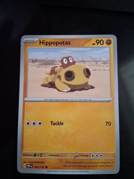 Expand your Pokémon collection with the Hippopotas card from the Prismatic Evolutions set. This common card, numbered 052/131, features the dependable Basic stage Pokémon, Hippopotas, ready to make a valuable addition to your deck or display. With its Regular finish, the card presents the classic look and feel of the Pokémon Company's craftsmanship.