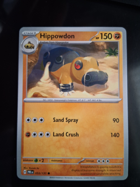 Discover the might of Hippowdon with this regular finish Pokémon card from the Prismatic Evolutions set. Card number 053/131, this piece showcases the earth-shaking capabilities of the Stage 1 Pokémon in stunning detail. With a robust 150 HP, it's an essential addition for trainers looking to bolster their collection with a Common rarity card.