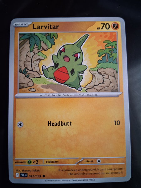 Explore the world of Pokémon with the 047/131 Larvitar card from the Prismatic Evolutions set. This common card features the intriguing Larvitar, a creature that delights in strategical battles. With a standard finish on card stock material, this piece fits seamlessly into any existing collection. It's an ideal pick for trainers aged 6 and above, ensuring a delightful addition to your Pokemon TCG assortment.