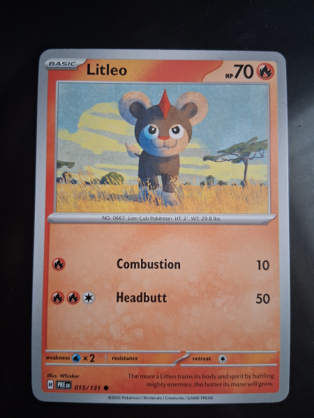 Explore the world of Pokémon with the Litleo card from the Prismatic Evolutions set, an essential addition for enthusiasts and collectors alike. Card number 015/131, this Common Card features Litleo in a stunning regular finish, capturing the fiery spirit of the beloved mid-stage evolution Pokémon. With its English language print and standard card size, it's a perfect fit for any existing collection. Crafted by The Pokémon Company International and manufactured in the USA, this Pokémon TCG card is designed for players aged 6 and up. The card is printed on high-quality card stock, ensuring durability and a premium feel. Add Litleo to your deck or display and enjoy the timeless appeal of the Pokémon Trading Card Game.