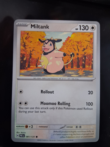 Delve into the world of Pokemon TCG with the Miltank card from the Prismatic Evolutions set. This common card, numbered 081/131, features the sturdy Miltank, a Basic Stage Pokémon with 130 HP. Ideal for collectors and players alike, it's a must-have for its role in the game and its place in the esteemed Prismatic Evolutions collection. Crafted from quality card stock, this English-language card is ungraded, ensuring it's in a form that's either near mint or better. Manufactured by The Pokemon Company International in 2025, it's designed for enthusiasts aged 6 and above. Add this piece to your deck or display it proudly as part of your Pokemon Trading Card Game assemblage.