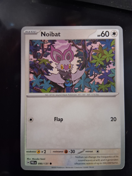 Dive into the world of Pokémon with the Noibat card from the Prismatic Evolutions set, a must-have for enthusiasts and collectors alike. Card number 090/131, this common card features the nocturnal Pokémon, Noibat, depicted in stunning detail. It's a standard-sized card crafted from quality card stock, ensuring durability and a premium feel. This English-language card, produced by The Pokémon Company International in 2025, is ideal for trainers aged 6 and above. With an HP of 60, Noibat is ready to take on any challenge in your Pokémon TCG battles. Add this regular finish card to your collection and continue to evolve your game today.