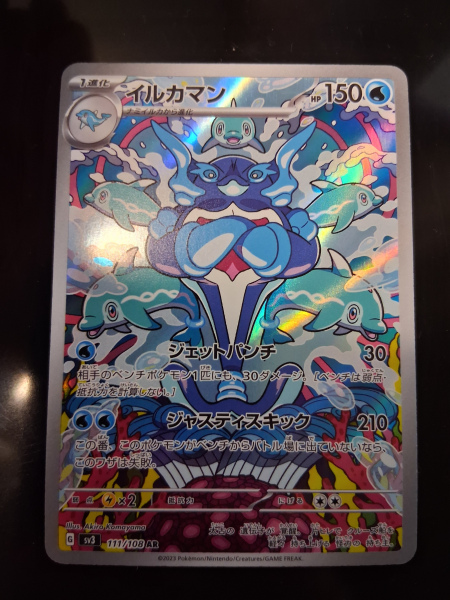 The Pokemon SV3 Ruler of The Black Flame Palafin Japanese Edition 111/108 AR is a highly sought-after collectable card from the Pokémon TCG. Manufactured by Nintendo in Japan, this full art card features a holographic finish and is in near mint condition. With exclusive Japanese language text and a unique card number, this rare item is perfect for collectors and fans of the Pokémon franchise. The card's vintage appeal and connection to the Nor Con event make it a valuable addition to any card game collection.