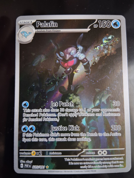 Dive into the world of Pokémon TCG with the Palafin card from the Scarlet & Violet: Paldean Fates set, card number 225/091. An illustration rare with a holographic finish, this Stage 1 Water-type Pokémon is a dazzling addition to any collection or competitive deck. Boasting a robust 150 HP and two attack options, Palafin can dish out damage to your opponents' Pokémon, both on and off the bench. Palafin's attacks include the powerful Justice Kick, which delivers 210 damage to a single opponent's Pokémon, but only if Palafin has remained on the bench that turn. The card also features a retreat cost of 2, ensuring strategic play. With its Lightning weakness, players must consider the elemental composition of their deck when incorporating Palafin into their arsenal.