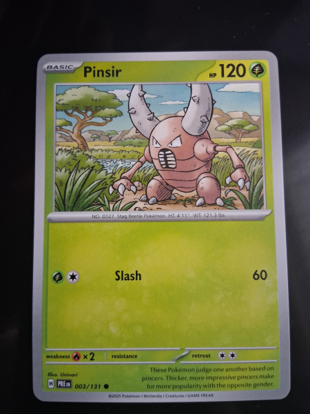 Delve into the world of Pokémon with the Pinsir card from the Prismatic Evolutions set, a must-have for enthusiasts and collectors alike. This common card, numbered 003/131, features the resilient Pinsir in a striking design, ready to add depth to your Pokémon TCG collection. Manufactured by The Pokémon Company International, this card is a staple for players aged 6 and above, showcasing the standard card size beloved by fans worldwide.
