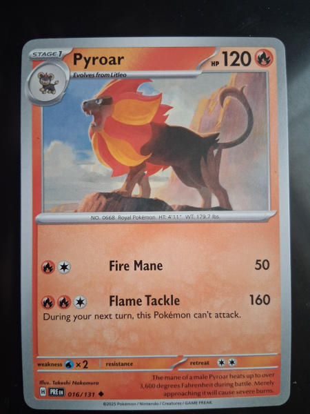 Explore the world of Pokémon with the 016/131 Pyroar card from the Prismatic Evolutions set. This uncommon card features the fiery roar of the Pyroar, illustrated with stunning art by Tokeshi Nakamura. It's a must-have for trainers and collectors alike, adding a touch of heat to your Pokémon TCG arsenal. This English-language card is produced by The Pokémon Company International and adheres to standard card size dimensions. Suitable for ages 6 and up, it's crafted from quality card stock material. Add this Pyroar card to your deck or display and let the fierce battles begin.