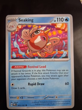 Dive into the world of Pokemon TCG with the Seaking card from the Prismatic Evolutions set. A treat for collectors and players alike, this Uncommon card features the tenacious Seaking, ready to assert its dominance in any battle. Card number 021/131, it's a standout piece with standard finish and dimensions that fit seamlessly into your deck or display. Nelmal's artwork brings Seaking to life, capturing the character's spirited energy. Manufactured by The Pokemon Company International in 2025, this English-language card is designed for enthusiasts aged 6 and up. Add this robust Pokemon to your collection and experience the thrill of the hunt in the Pokemon Trading Card Game.