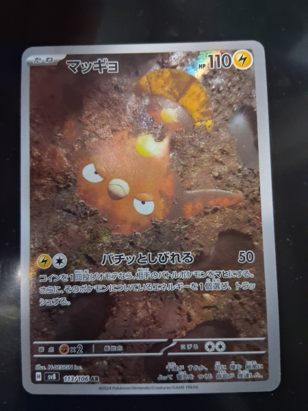 The Pokemon Stunfisk AR 113/106 SV8 Super Electric Breaker Card is a highly sought-after collectible in the Pokémon Trading Card Game. This Japanese card features the character Stunfisk, a fish-type creature, with a striking foil finish. Manufactured by Nintendo as part of the Scarlet & Violet set, this card is a valuable addition to any collector's deck. With its rarity and unique abilities, this card is sure to stand out in any Pokémon TCG collection.